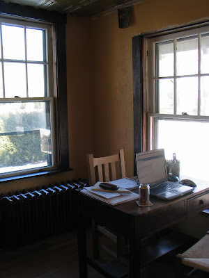 Did we ever tell you about this desk? Craigslist find. We don't have as good luck as Jason the Craigslist Jedi Master - but this one worked out. It was 2 hours south of here, but we had to be there anyways for an appointment, so it worked out. It's a partners-type desk - one drawer on each side opens and they each have a lid and an inkwell hole. It's not the greatest design or construction (the legs aren't done in a way Stickley would have done it), but I love it anyways. And - we didn't have to strip any paint!